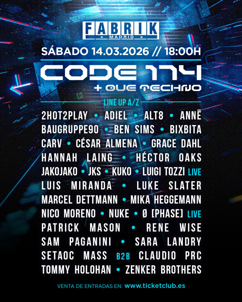 Aún sin haberse celebrado CODE 173, FABRIK ya ha desatado la expectación entre su público con el anuncio de CODE 174, que tendrá lugar el 14 de marzo. La sesión más longeva y representativa del club regresa con una edición de gran formato: cinco áreas activas, más de 12 horas de música ininterrumpida y un line up repleto de nombres clave de la escena internacional.