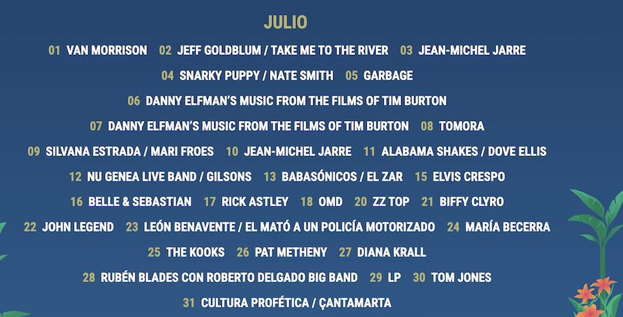 También destacan propuestas internacionales como Belle & Sebastian, iconos del pop escocés; Two Door Cinema Club, maestros del indie electrónico bailable; Pat Metheny, figura esencial del jazz contemporáneo; o Rubén Blades con Roberto Delgado Big Band, leyenda viva de la salsa y la música latina.
