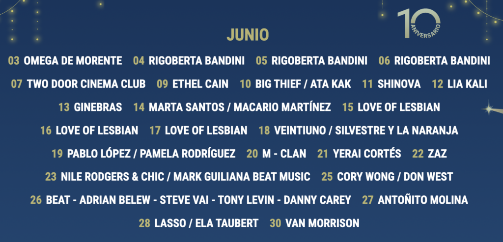 En clave nacional, Rigoberta Bandini, fenómeno pop generacional, encabeza varias fechas consecutivas; Love of Lesbian, referentes del indie español, ofrecerán tres noches especiales; Lia Kali, una de las voces urbanas más sólidas del momento, confirma el peso de la nueva escena; y Ginebras, con su pop desenfadado y directo, refuerzan la presencia femenina en el cartel.