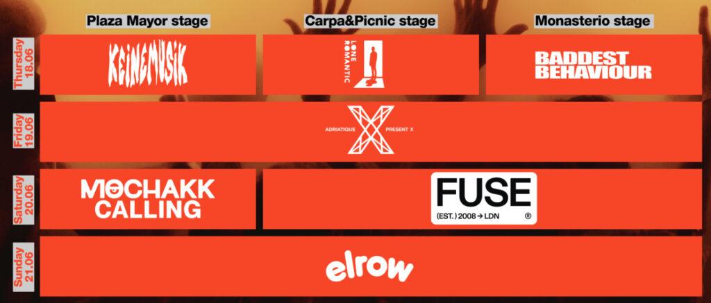 Entre los eventos confirmados destacan propuestas como Rampa & Adam Port, Adriatique presents X, Baddest Behaviour by Mau P, Lone Romantic by Maceo Plex, FUSE London, Mochakk Calling y elrow, que cerrará la programación del domingo.